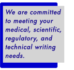 Susan has built a network of many contract writers, editors, publishers, and proofreaders. Among them are physicians, research scientists, medical device engineers, biostatisticians, medical monitors, regulatory affairs and drug safety professionals, and data management experts. In addition to providing writing services, Susan can assemble and supervise a project team from this pool to tackle big medical writing jobs, such as NDAs or BLAs as eCTDs.
